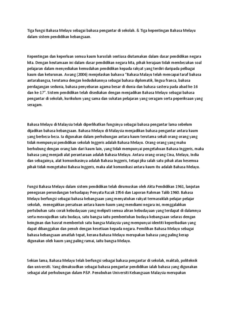 Bahasa Melayu Harus Kembali kepada Akar : Klik Web DBP from klikweb.dbp.my Langkah bahasa melayu sebagai bahasa pengantar ilmu disarankan dalam laporan razak 1996 dan kemudian diperkuat dalam laporan abdul rahman talib 1960. Walaupun kedudukan bahasa melayu sudah terjamin sebagai bahasa kebangsaan,bahasa rasmi dan bahasa pengantar pendidikan dan dewan bahasa dan pustaka(dbp) peranan bahasa melayu sebagai bahasa ilmu dan juga asas perpaduan mulamenempuhi cabaranya yang tersendiri. Bahasa melayu sebagai bahasa pengantar ilmu di institut pengajian tinggi bermula pada tahun 1983. Merunut perkembangan sejarah bahasa indonesia, berarti membicarakan bahasa melayu sebagai akar bahasa indonesia yang kita gunakan sekarang. Bahasa indonesia sebagai alat pengantar dalam dunia pendidikan. Maaf nie gan bru nubi pengen berbagi ajah. Sehingga pemakaian bahasa indonesia dalam dunia pendidikan bukan hanya terbatas pada bahasa pengantar, akan tetapi bahan'bahan ajar juga memakai bahasa indonesia. Bahasa indonesia sebagai media komunikasimakalahdiajukan untuk memenuhi tugas mata kuliahbahasa indonesia oleh:haris maiza putra c52212099lukman chakim putra c52212106dwi apriliawati c52212115ifa al mufida c72212137m.