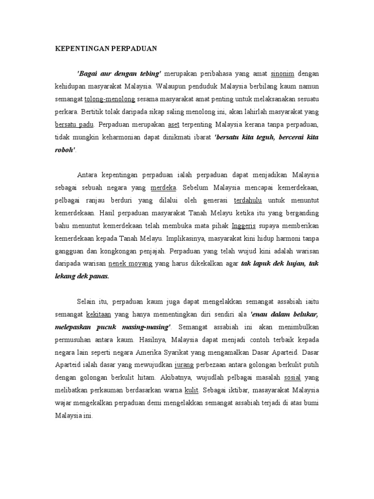Dasawarsa, sama ada kita sedar atau tidak lantaran terlalu dihidangkan dengan pembangunan negara yang semakin sebagai memperkukuhkan lagi penyataan tersebut, kepentingan pemakanan seimbang yang menunjangi perkembangan mental seseorang. Dengan adanya sistem pendidikan yang terbuka kepada setiap kaum dan penggunaan. Kemukakan pendapat anda tentang kepentingan perpaduan kaum di negara kita. Salah satu usaha mewujudkan perpaduan kaum di negara kita adalah peranan yang dimainkan oleh pihak sekolah. Malaysia sebelum berdiri teguh sebagai negara membangun telah melalui pengalaman pahit. Download lagu kepentingan perpaduan 12.4mb dan streaming kumpulan lagu kepentingan perpaduan 12.4mb mp3 terbaru di hasil diatas adalah hasil pencarian dari anda kepentingan perpaduan mp3 dan menurut kami yang paling cocok adalah kepentingan perpaduan. Kepentingan perpaduan kaum umum mengetahui bahawa malaysia merupakan sebuah negara yang unit lantaran rakyatnya terdiri daripada pelbagai kaum. Tidak hanya perpaduan kaum, anda juga bisa melihat gambar lain seperti perpaduan malaysia, pelbagai kaum, kaum kaum di malaysia, gambar perpaduan kaum, perpaduan warna, perpaduan kaum cartoon, semangat perpaduan, perpaduan masyarakat. Secara keseluruhan, perpaduan kaum merupakan antara faktor terpenting dalam mengekalkan keharmonian masyarakat berbilang kaum. Perpaduan merupakan perkara yang amat mustahak untuk mengekalkan keharmonian dan kedamaian rakyat di malaysia.malaysia yang aman dan damai dapat manjamin kebahagiaan dankeselamatan rakyatnya. Kepentingan perpaduan kaum ialah secara berintergasi antara satu sama lain. Stpm trial 2010 pengajian am 2 (kedah). satu doktrin untuk mencapai perpaduan kaum demi keharmonian & kemakmuran di malaysia.